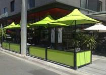 The corrosion-resistant aluminium frame is reinforced with marine-grade stainless steel componentry. Concealed catenary cables strengthen the canopy and help maintain its shape, improving performance and longevity. The architectural grade PVC canopy is UV resistant, heat reflective and waterproof, giving customers a cool and comfortable space to enjoy food and drinks outdoors. The fabric is pre-tensioned to prevent stretching and is coated for easy cleaning in busy commercial settings.